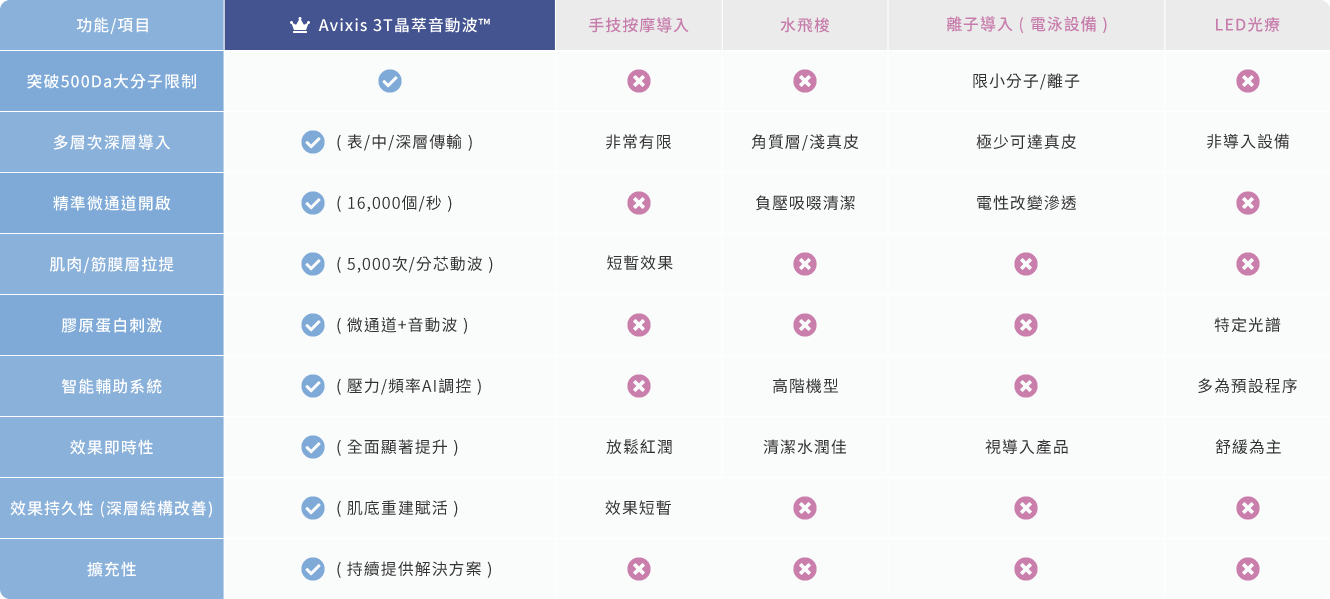 我們將3T-晶萃音動波™與市場上常見的護膚技術進行客觀比較,